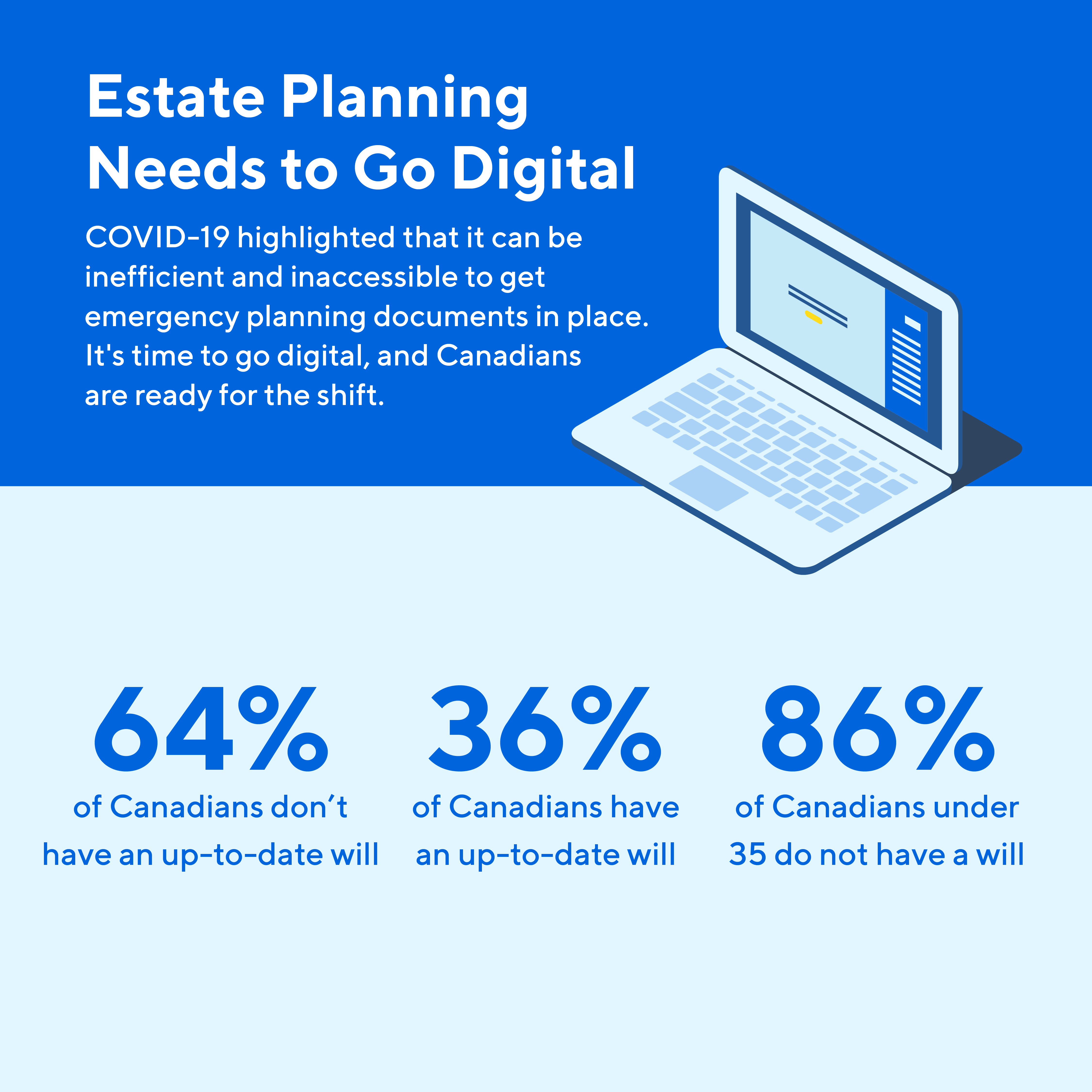 According to an AngusReid survey commissioned by Willful, 64% of Canadians don’t have an up-to-date will, and 24% would have completed their will earlier if they had been able to do it online. COVID-19 made it difficult to finish wills due to printing, in-person witnessing, & offline appointments. The time to update estate laws is now.